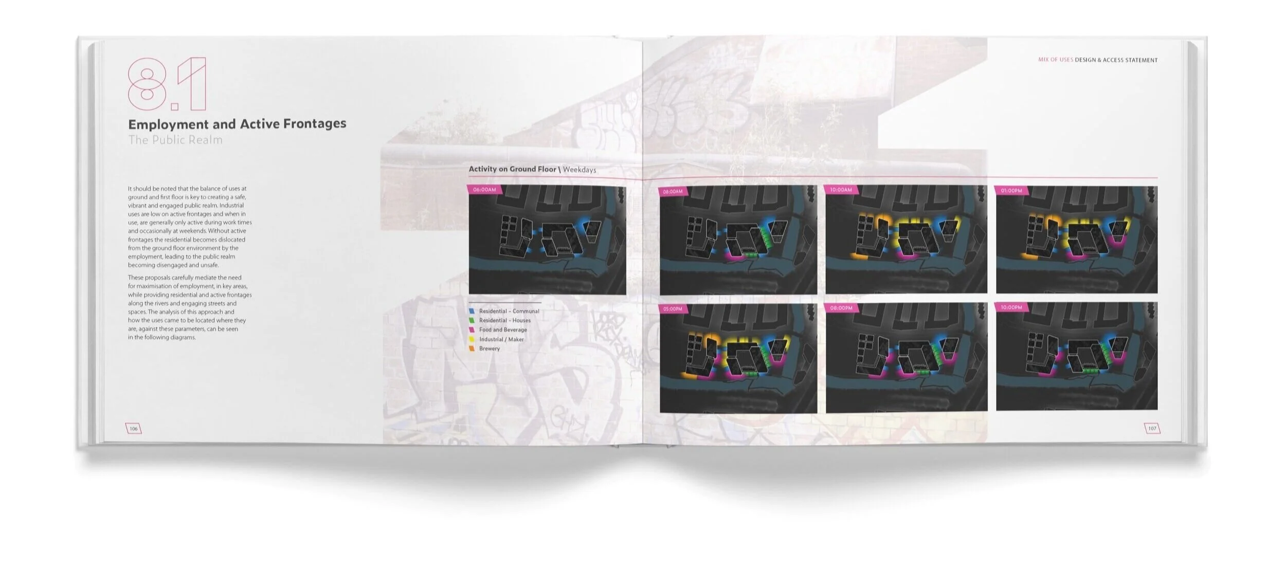 To interpret the brief I created a typographic logo by deconstructing letter forms and overlapping them, reflecting the mix of uses within the development and their interaction with each other. This brand identity could then be applied to a range of documents such as the design and access statement.